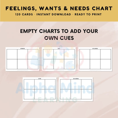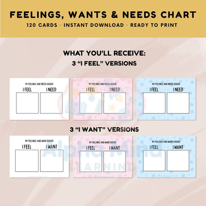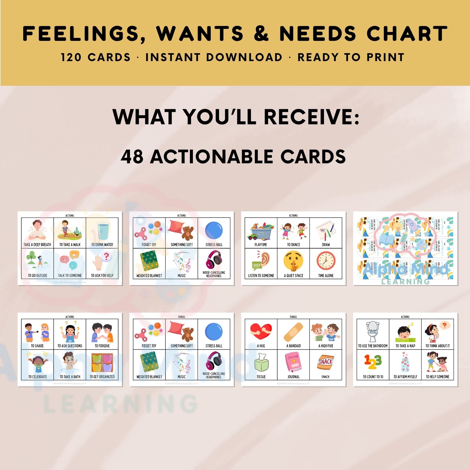 120 "I Feel I Want I Need" Chart Printable Cards, Feelings and Needs Visual Coping Skills, Non-verbal Visual Aid, Early Education & Autism