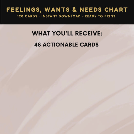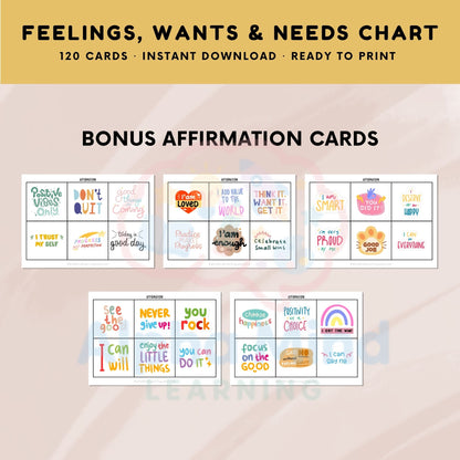 🗸 Cards: 120 total (24 boy emotion cards, 24 girl emotion cards, 48 actionable/needs cards, 24 Affirmation carks, Bonus blanks)
