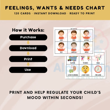 This complete set of 120 Printable Feelings, Wants & Needs Cards helps kids, autistic learners, and nonverbal or speech-delayed individuals communicate emotions and needs with ease. Perfect for home, classroom, or therapy sessions, this set supports self-regulation, social-emotional learning, and visual communication.